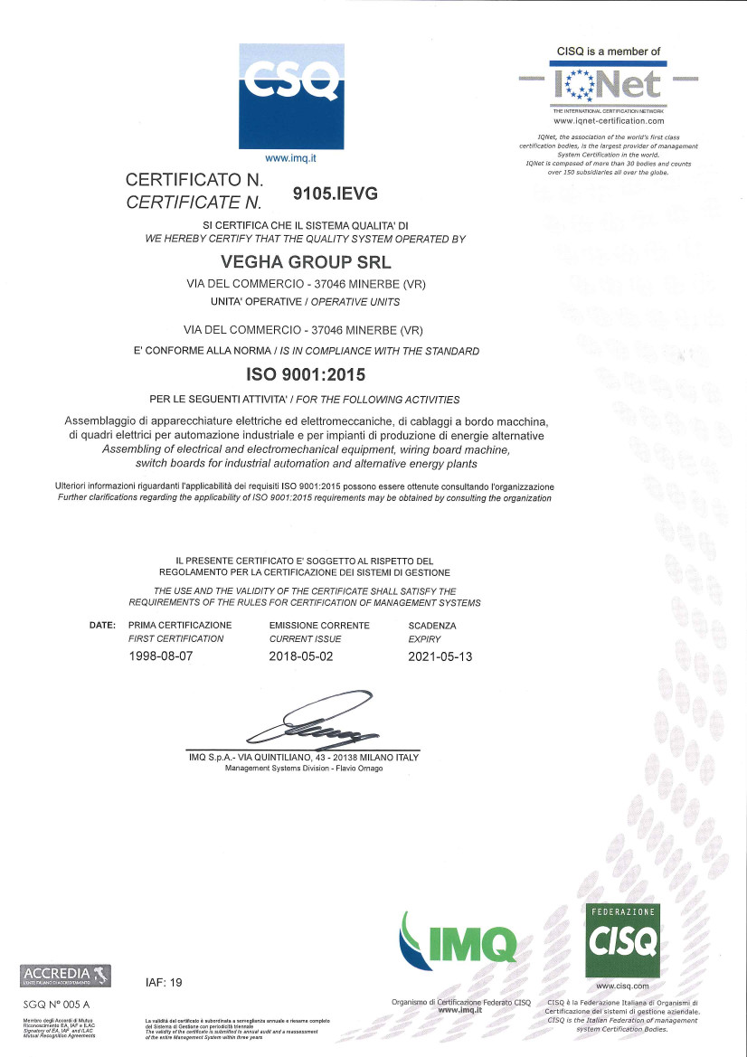 VEGhA GROUP è conforme alla normativa ISO 9001:2015 per le seguenti attività: